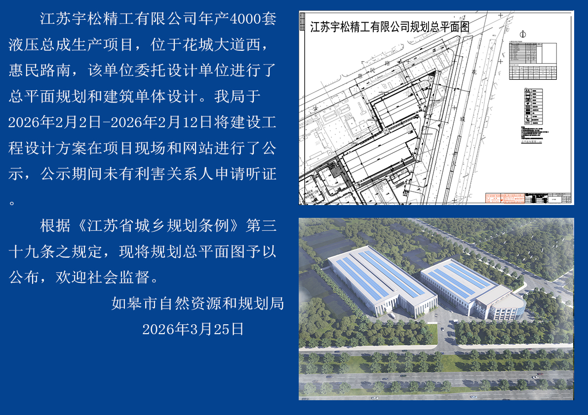 江苏宇松精工有限公司年产4000套液压总成生产项目建设工程设计方案批后公布